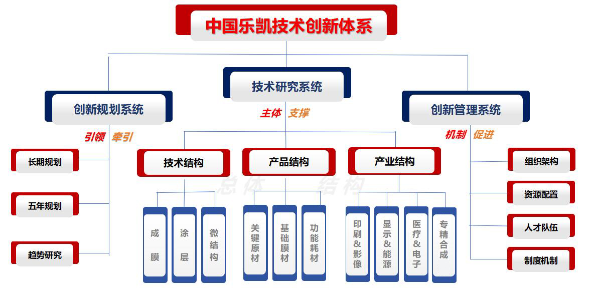 中國(guó)樂(lè)凱擁有以技術(shù)創(chuàng)新規(guī)劃系統(tǒng)為引領(lǐng)和牽引、以技術(shù)研究系統(tǒng)為主體支撐、以創(chuàng)新管理系統(tǒng)促進(jìn)體制機(jī)制優(yōu)化的完善、高效的技術(shù)創(chuàng)新體系。創(chuàng)新規(guī)劃系統(tǒng)主要發(fā)揮引領(lǐng)、牽引作用,把準(zhǔn)脈搏、認(rèn)清發(fā)展趨勢(shì),明確重點(diǎn)、謀劃創(chuàng)創(chuàng)新方向,為中國(guó)樂(lè)凱持續(xù)發(fā)展提供動(dòng)力和保障;技術(shù)研究系統(tǒng)主要是深入開(kāi)展核心技術(shù)研究,進(jìn)行產(chǎn)品和關(guān)鍵原材料開(kāi)發(fā)井實(shí)現(xiàn)產(chǎn)業(yè)化,支撐中國(guó)樂(lè)凱發(fā)展,是中國(guó)樂(lè)凱技術(shù)創(chuàng)新體系的主體和支撐;創(chuàng)新管理系統(tǒng)主要發(fā)揮體制機(jī)制促進(jìn)作用,監(jiān)控創(chuàng)新體系有效運(yùn)行,發(fā)揮支撐保障作用,推動(dòng)技術(shù)創(chuàng)新體系健康良性發(fā)展。